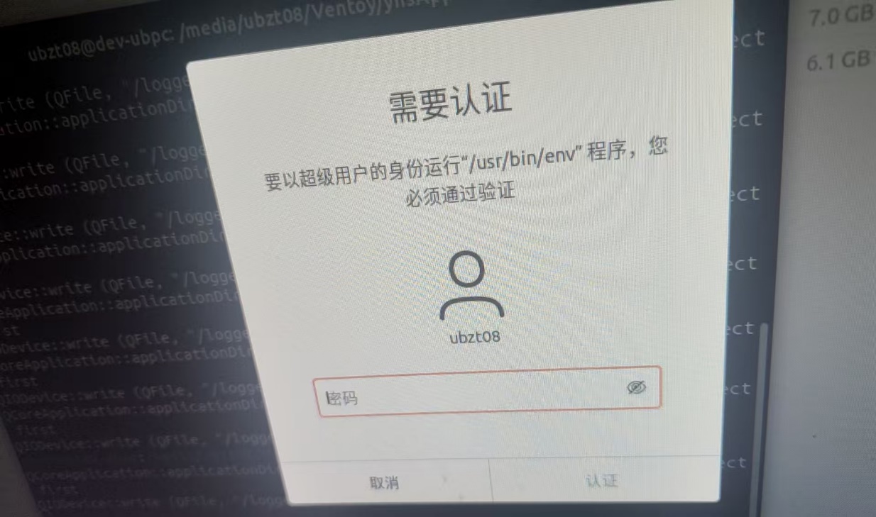 第三步、在弹出'需要认证'窗口输入当前linux用户密码