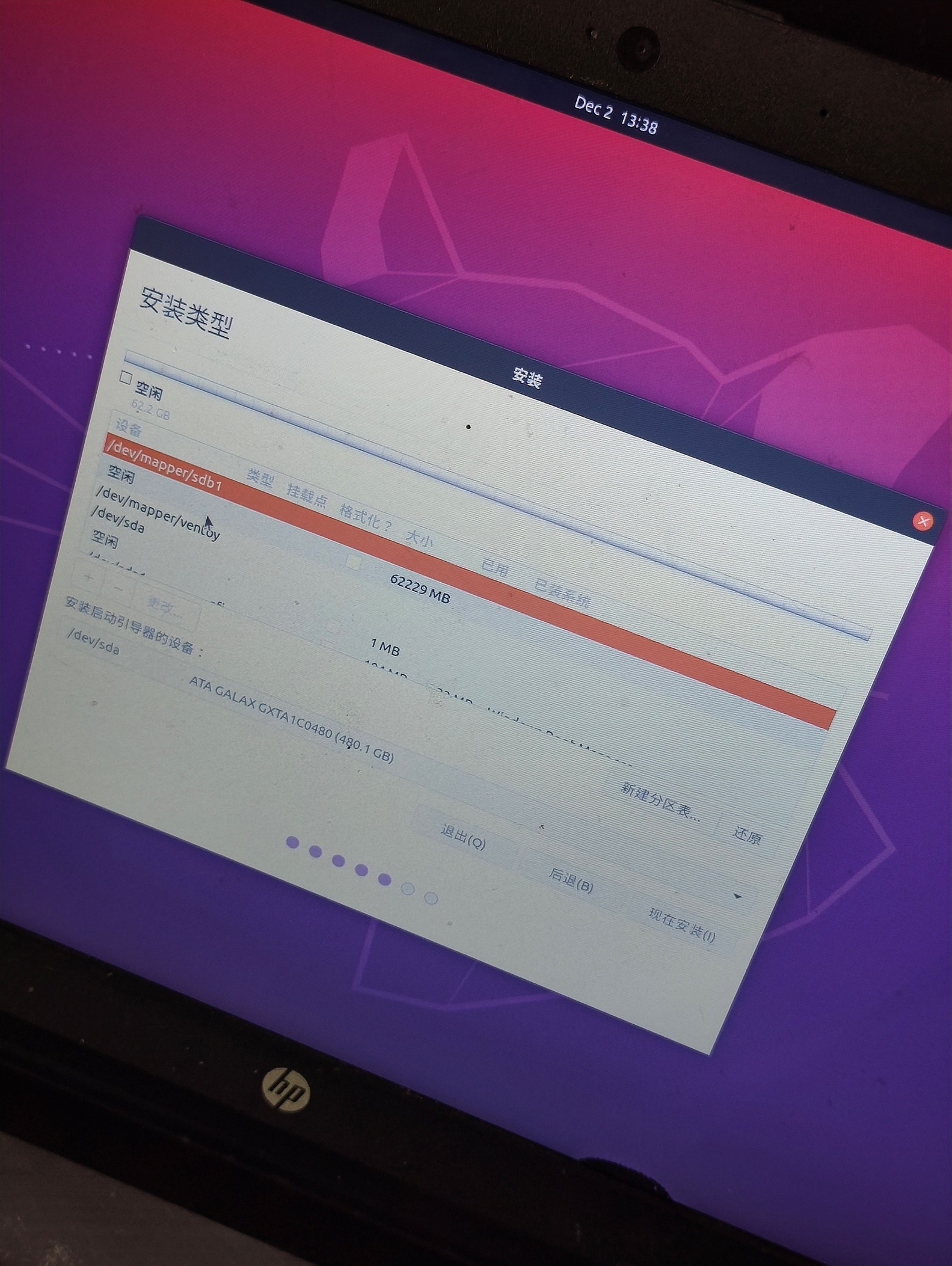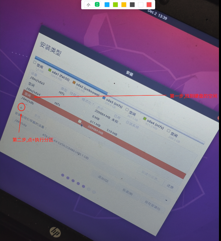 2.1.2.12继续在【安装类型】界面的"分区"界面,找到硬盘的空闲区域,划出内存1.5倍左右"交换分区", 千万别在U盘上执行错误分区