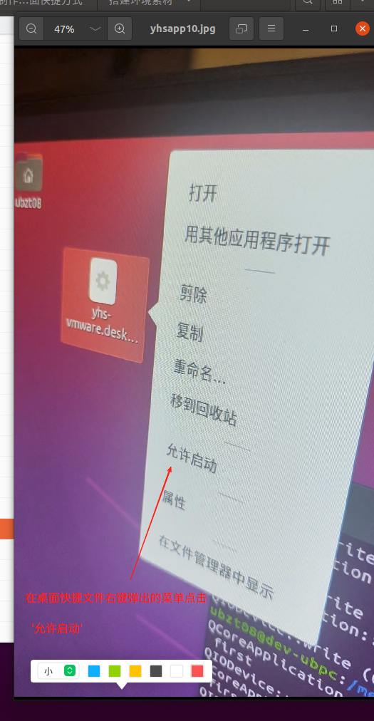 第一步、在桌面desktop-yhs.desktop文件右键点击,再弹出菜单选中'允许启动'