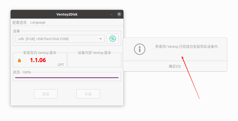 两次确认后出现进图条开始制作,当出现【恭喜你Ventory已经成功安装到此设备中】代表制作成功,window版本也大同小异。