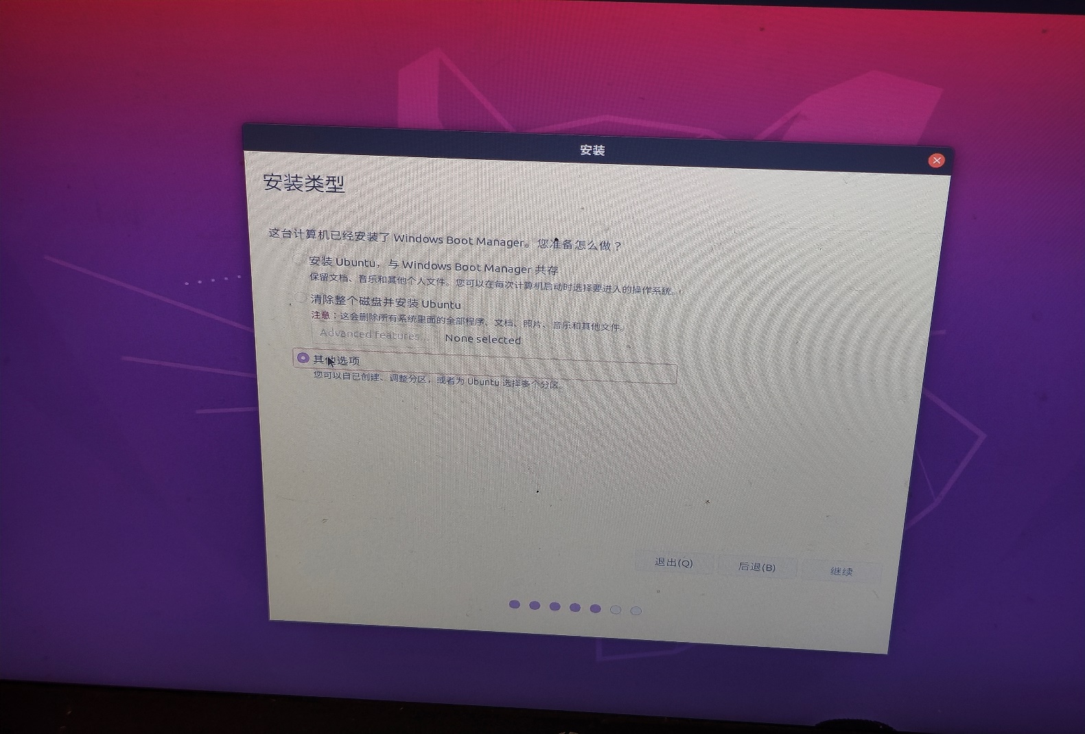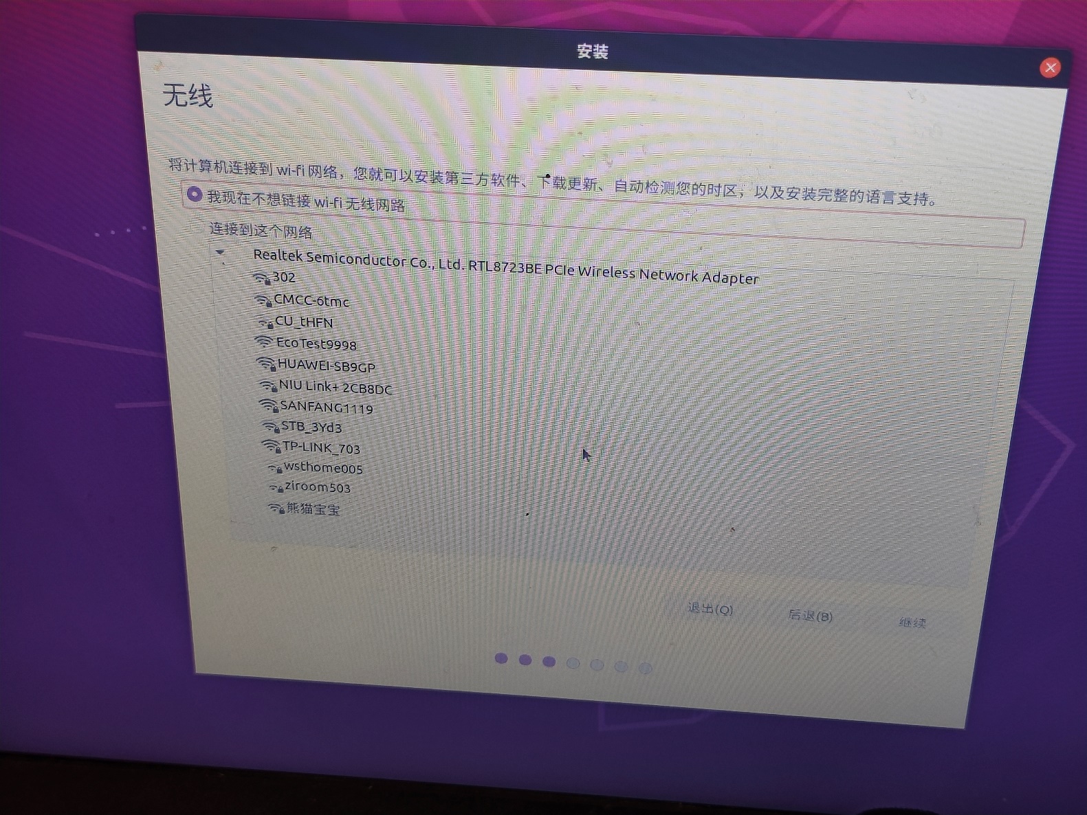 2.1.2.16执行【继续】,根据自己的需要(如暂不要联网,用户名密码等界面)继续标准ubuntu的安装完成(忽略一些不重要的步骤)