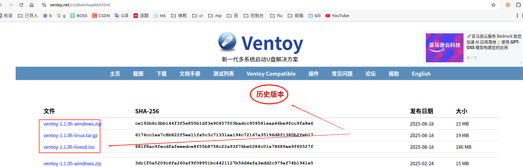 在https://www.ventoy.net/cn/downloadold.html官网下载指定版本的ventoy工具,如果要加快下载,可选择镜像站。