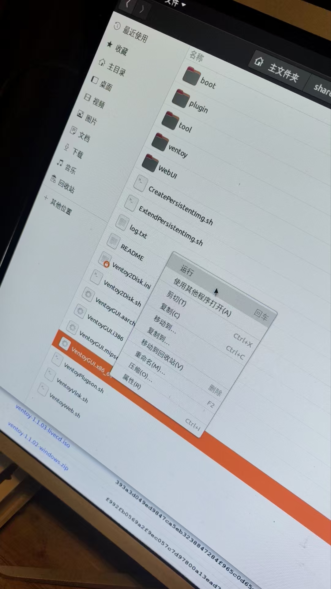 选择合适的执行文件,笔者以ubunut20.04简单说明右键打开解压文件夹中VentoyGUI.x86_64,在弹出菜单点击运行;