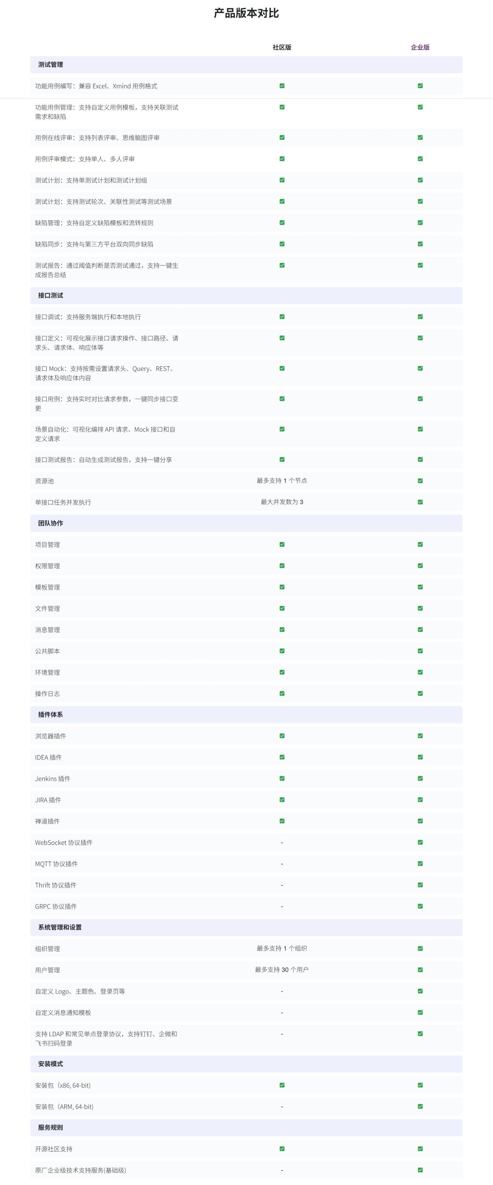 MeterSphere 产品分为社区版和企业版,两者的功能差异如下: