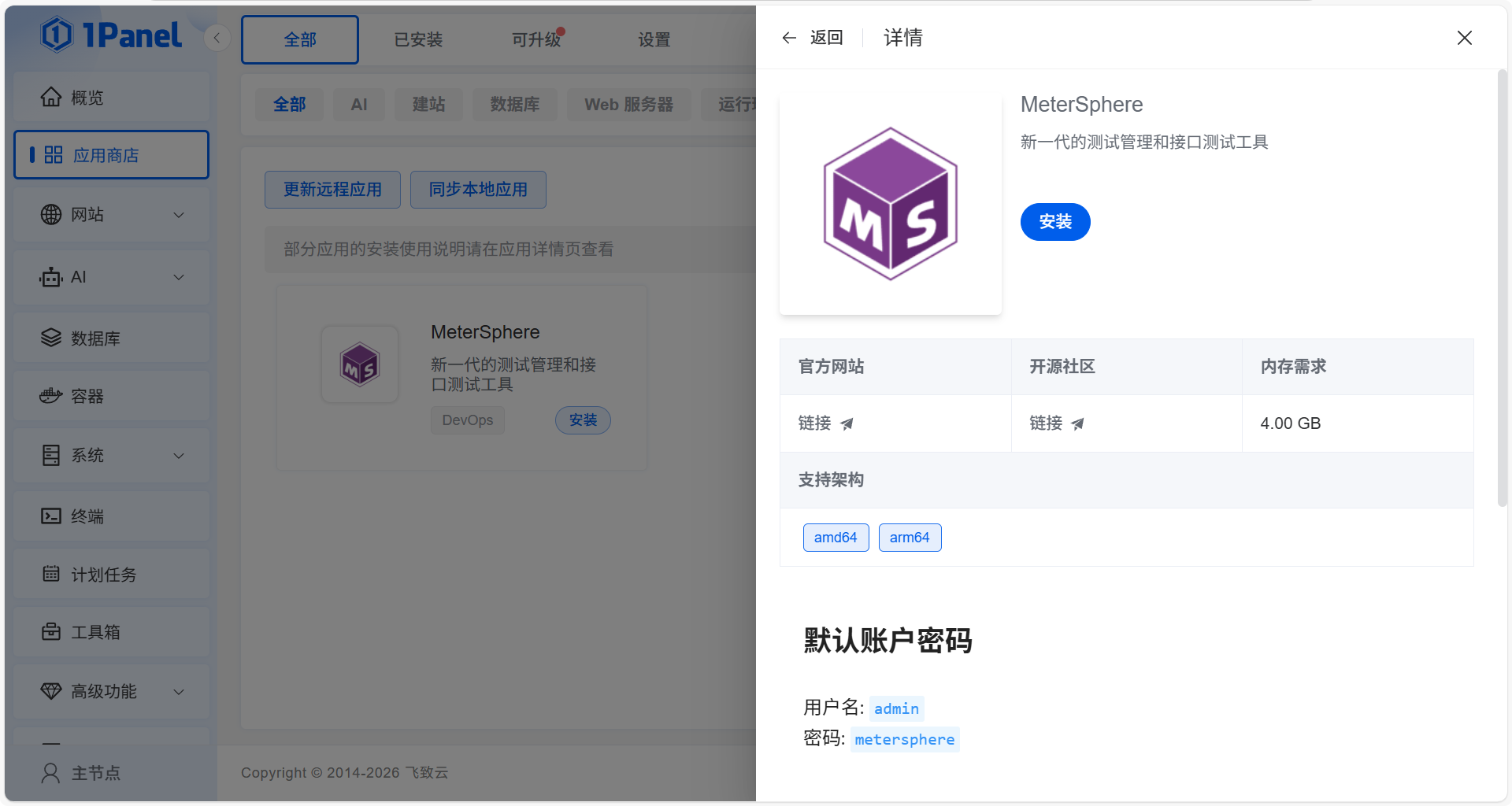 我们可以通过 1Panel 应用商店快速部署体验 MeterSphere:
