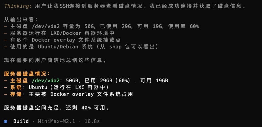 然后我觉得部署与运维是相当大的一块可改进点。因为本质上,运维部署属于类ETL的方式,都是高度确定的操作,而且因为与服务器交互的过程中,用vim编辑,输入命令行都是重复性很高的事。更别提在服务器上看配置,改配置,加装软件这样的操作。这件事应该在最近也变得比较可行了,以前的麻烦是有些工具(比如 cursor)会比较容易的作出损毁性操作,而有些工具则干脆不提供这样的操作。