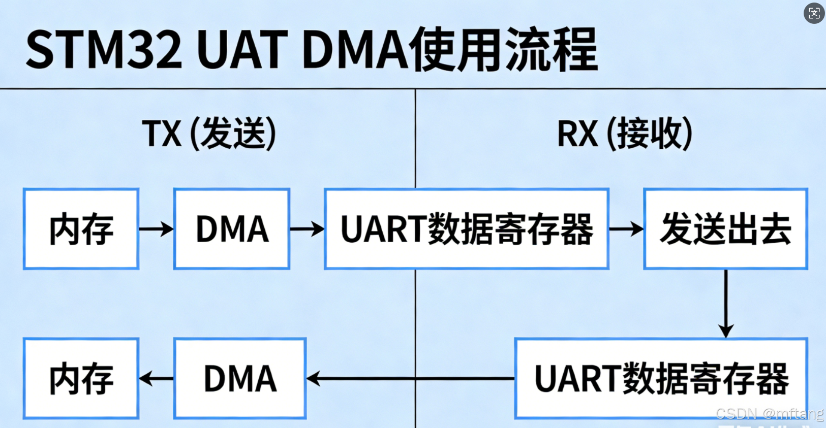 - TX(发送):内存 → DMA → UART 数据寄存器 → 发送出去