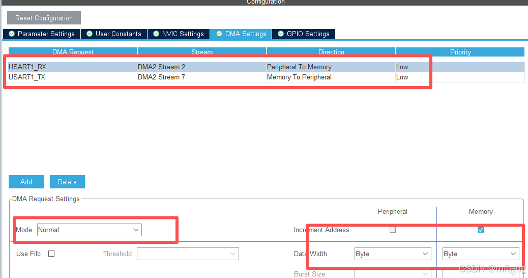 - USART1_TX:选择 DMA1 Channel4,传输方向「Memory to Peripheral(内存到外设)」。