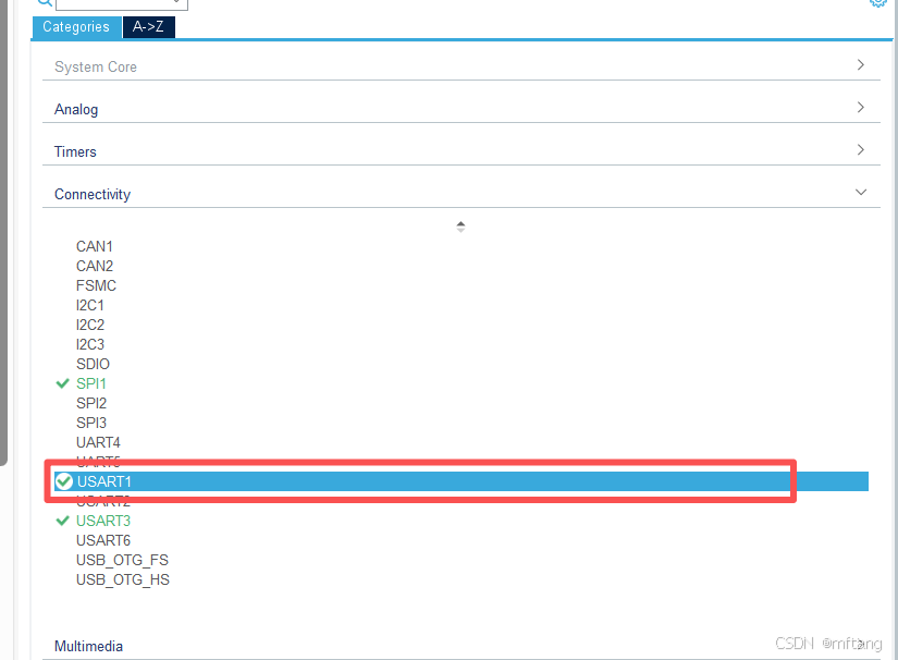 - 选择 USART1,模式设为「Asynchronous(异步)」。