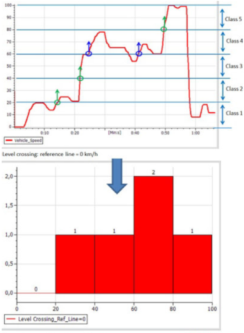 以"Vehicle_Speed"为源通道,上下限范围为0~100km/h,以每个类别为20km/h的等距来划分了5个速度类,并且参考线为0。信号每次在正方向上穿越过一个类别时,计数加1,并且计数速度信号从0km/h开始。从类别1穿越至类别2,正向穿越次数为1,且其它类别间的正向穿越同理。