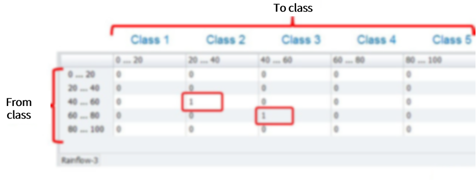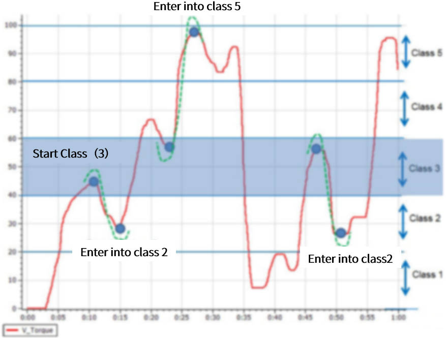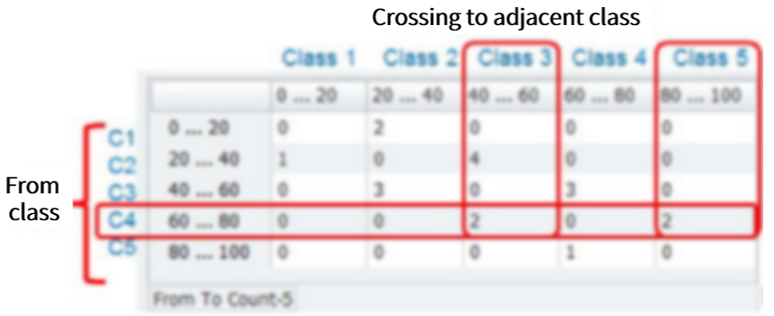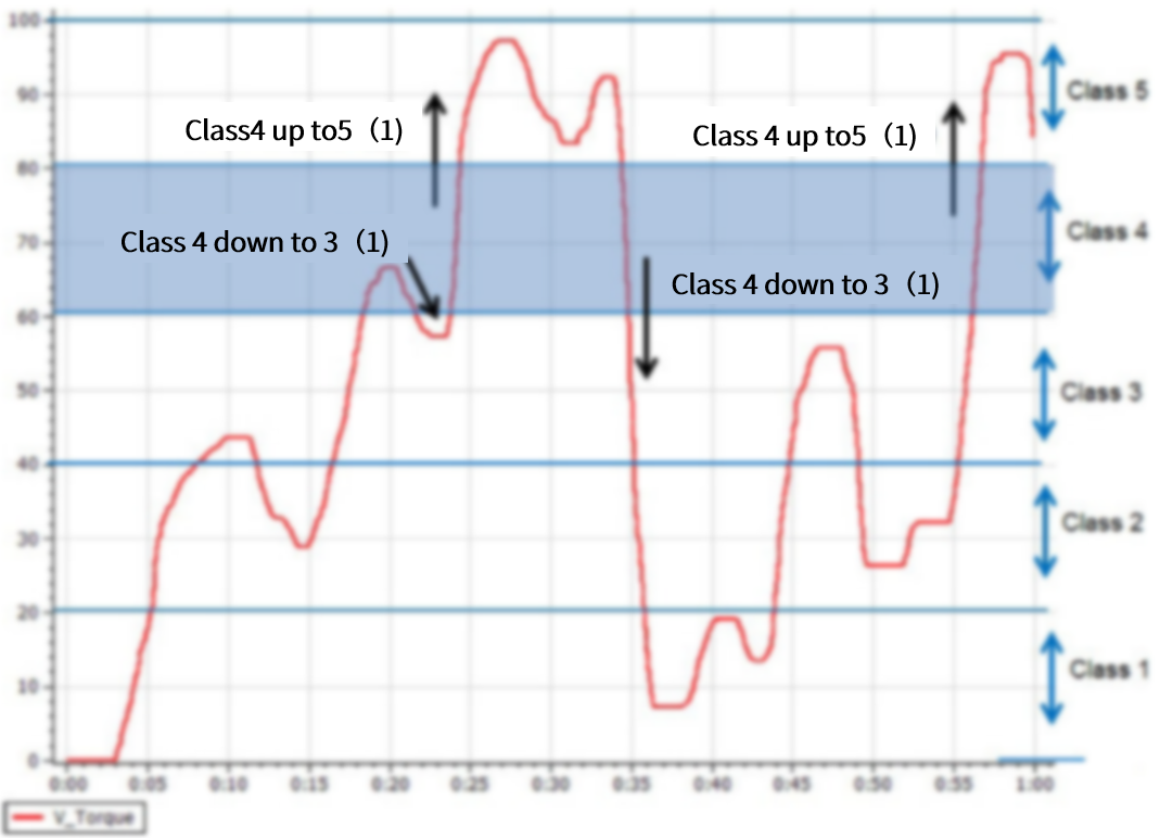 以"V_Torque"为源通道,上下限范围为0~100,以每个类别为20的等距来划分了5个类别。以类别4(60~80)与其相邻类别切换为例:从类别4穿越至类别5(80~100)次数为2,从类别4穿越至类别3(40~60)次数为2,并且计数结果可显示在矩阵表中。