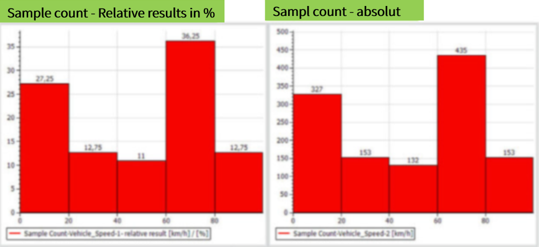 以"Vehicle_Speed"为源通道,上下限范围为0~100km/h,所有测量点均包含在其中,分为了5个类别,并按等距划分,每个类别为20km/h。