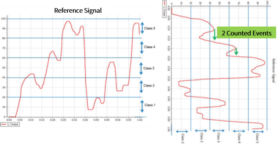 建议将参考信号图旋转90°,以便更好理解雨流的含义。在这一例子中,仅有2个事件计数,并且结果显示在矩阵表中。
