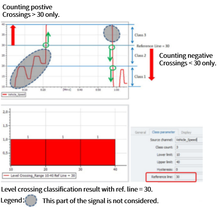以"Vehicle_Speed"为源通道,上下限范围为10~40km/h,以每个类别为10km/h的等距来划分了3个速度类,并且参考线为30。信号每次在正方向及负方向上穿越过一个类别时,计数加一,并且计数速度信号从30km/h开始(参考线30km/h大于分类下限10km/h,故负向类别穿越次数也将考虑在内)。