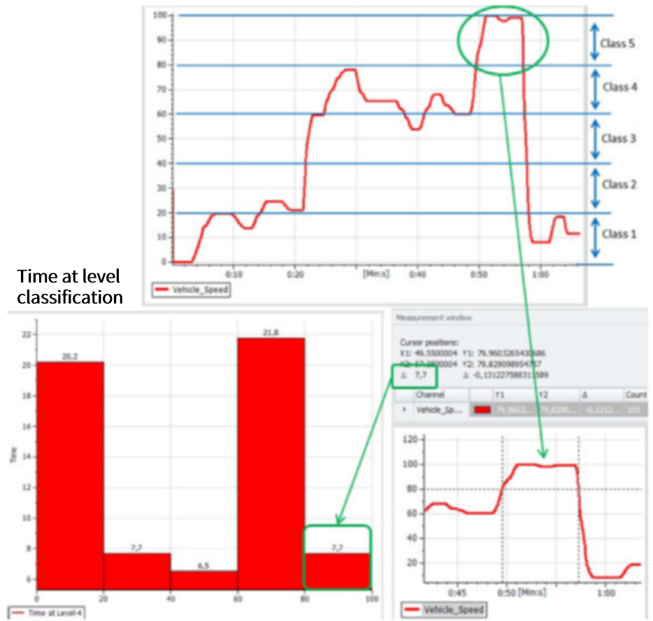 以"Vehicle_Speed"为源通道,上下限范围为0~100km/h,所有测量点均包含在其中,并以每个类别为20km/h的等距来划分了5个速度类。其中,80~100km/h的这一速度类中,时长为7.7s,且测量游标与分类计算结果是一致的。