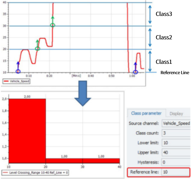 以"Vehicle_Speed"为源通道,上下限范围为10~40km/h,以每个类别为10km/h的等距来划分了3个速度类,并且参考线为10。信号每次在正方向上穿越过一个类别时,计数加一,并且计数速度信号从10km/h开始(10km/h不是初始速度,故正方向穿越参考线次数也包含在其中)。
