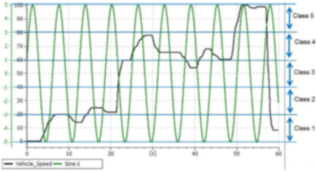 以"Vehicle_Speed"和"Sine-1"这2个信号作为源通道,"Vehicle_Speed"上下限范围为0~100,以每个类别为20的等距来划分了5个类别。同理,"Sine-1"上下限范围为-5~5,以每个类别为2的等距来划分了5个类别。在这一例子中,仅对"Sine-1"通道以时间级来进行计数,并且计数结果显示在分类表中......