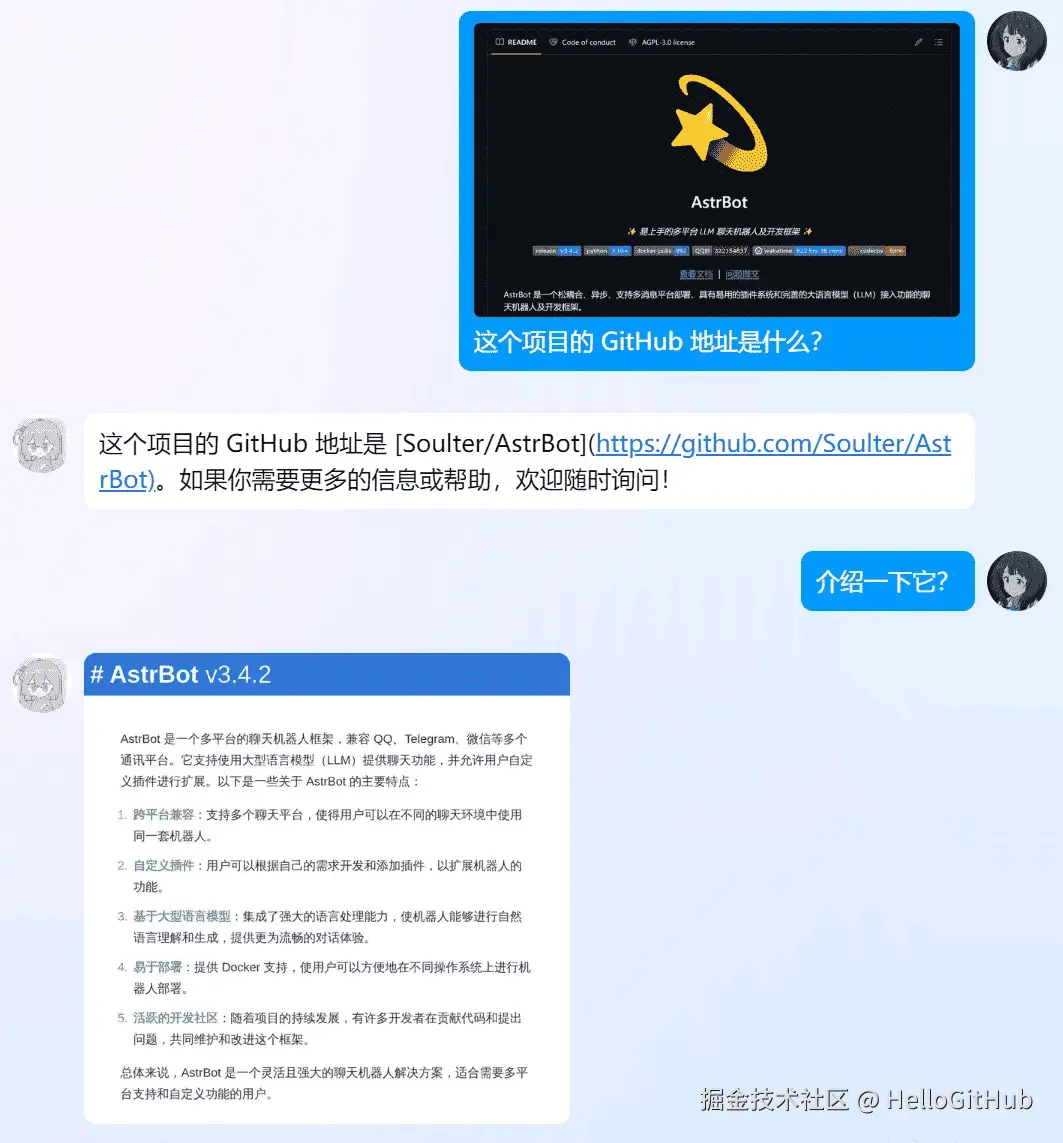 24、AstrBot:易上手的多平台 LLM 聊天机器人。该项目是基于 Python 构建的 LLM 聊天机器人及开发框架,支持集成多种消息平台和大语言模型。它提供了可视化管理面板和灵活的插件扩展机制,支持速率限制、白名单、关键词过滤、图片理解和语音转文字等功能。