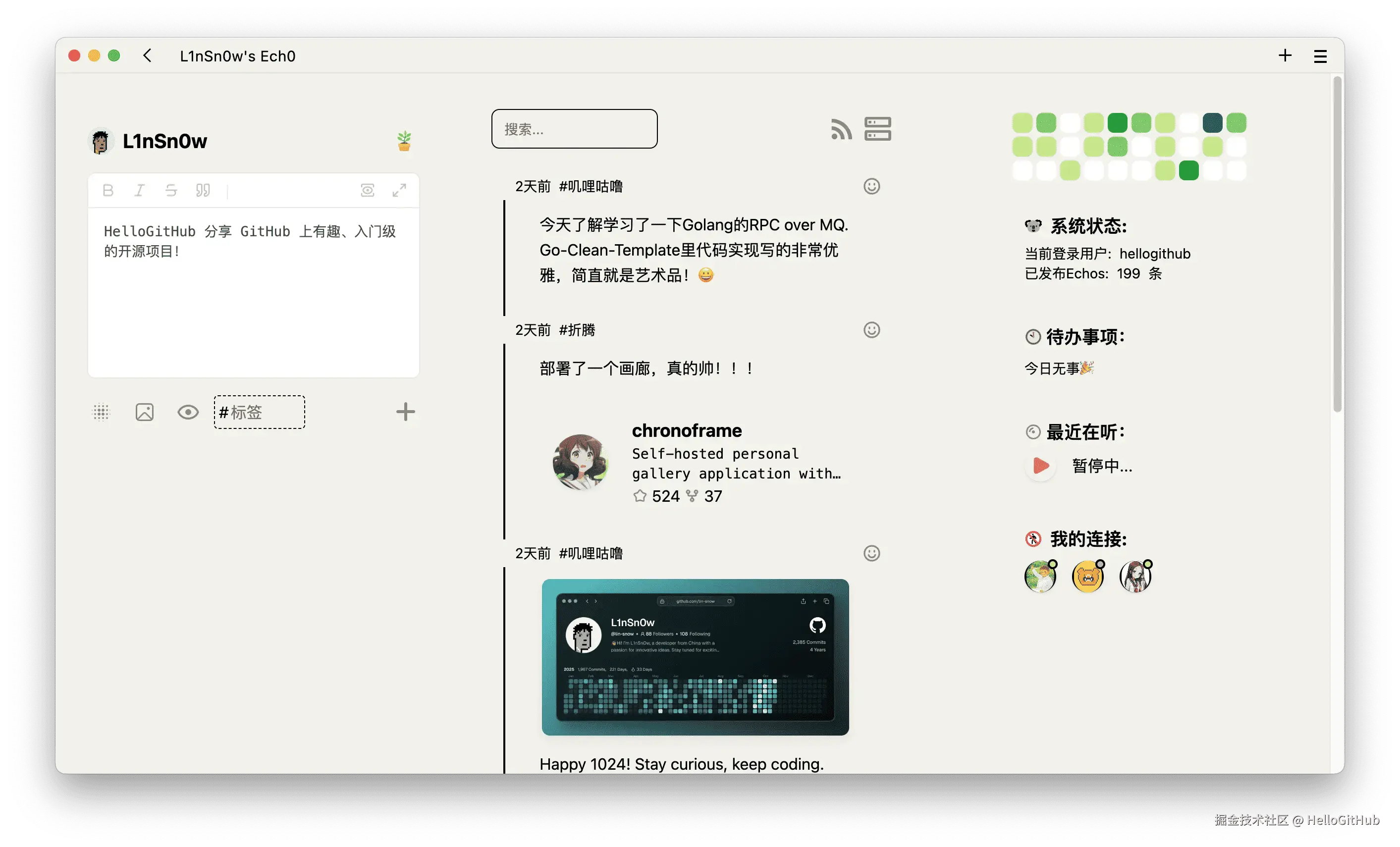 7、Ech0:清爽的轻量级内容分享平台。这是一款开源、自托管的轻量级内容发布平台,专注于思想流动和快速分享。它拥有简洁直观的操作界面,支持发布和分享想法、文字、图片和链接。同时,支持类似 ActivityPub 的联邦协议,实现不同实例(站点)之间的互联互通,让内容不再局限于单一孤立的网站。