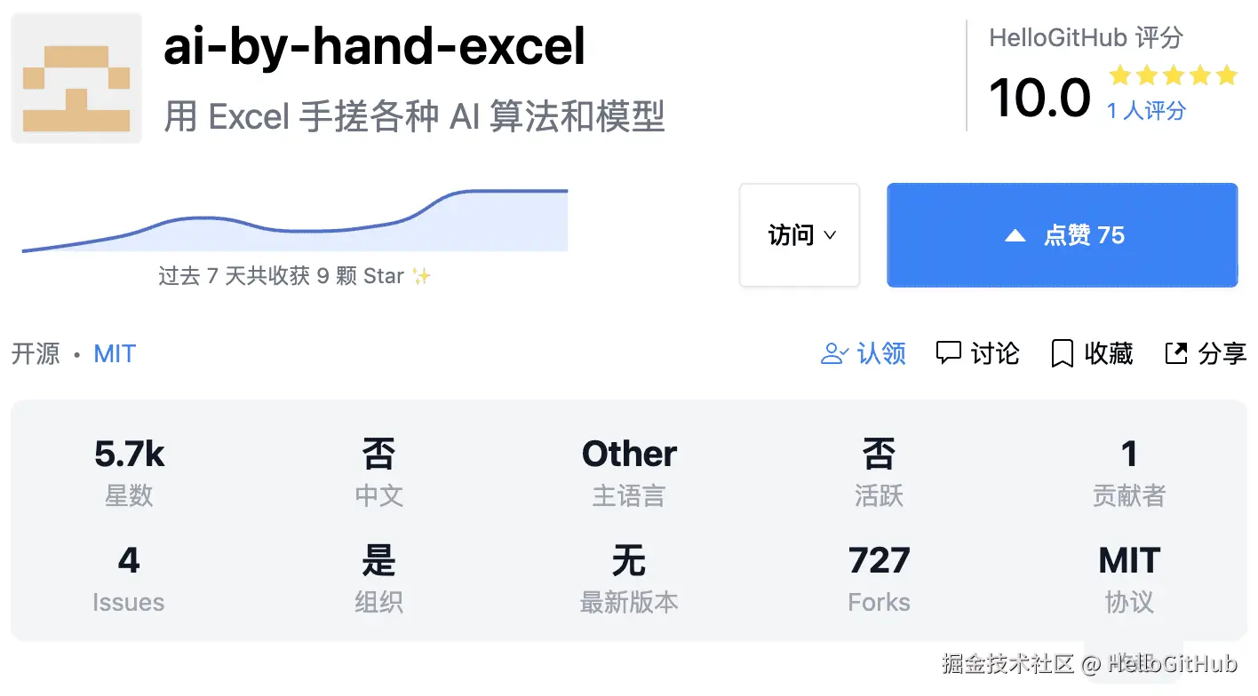 该项目是通过 Excel 的形式实现并演示人工智能与深度学习的核心算法和概念,让初学者可以动手操作并理解 AI 的运行原理,包括矩阵乘法、MLP、RNN、Transformer、ResNet 等,以独特且浅显易懂的形式,降低了 AI 学习的门槛。