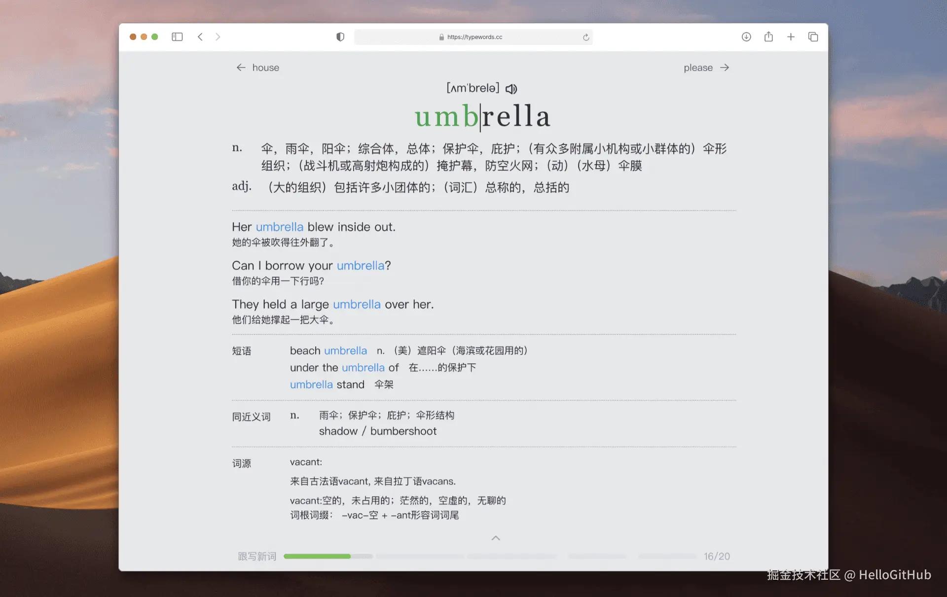 13、TypeWords:极简的打字背单词网站。这是一款基于网页的背单词软件,帮助用户通过键盘输入来记忆单词。它界面简洁、交互流畅,支持单词发音、错误统计和生词本等功能。
