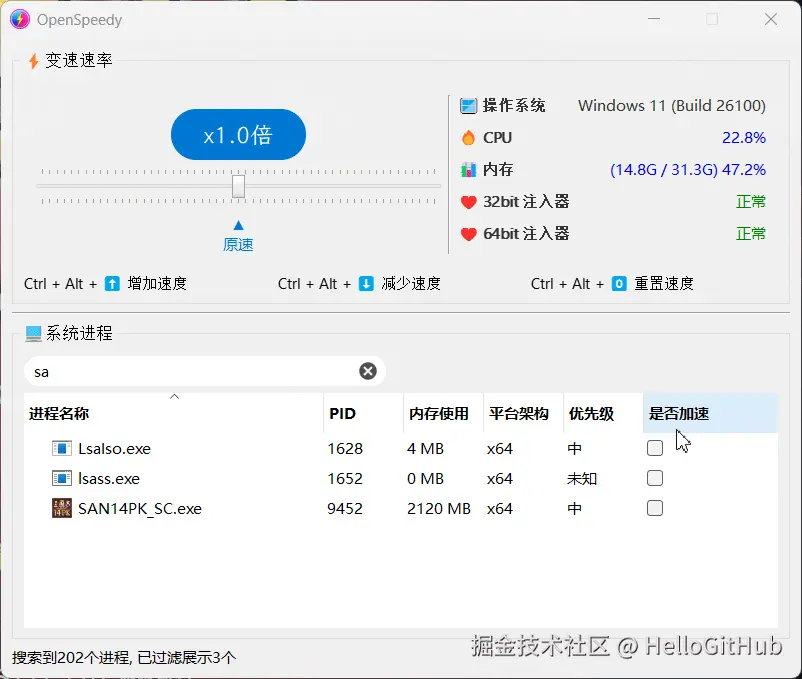 这是一款完全免费、开源的 Windows 游戏加速工具。它通过 Hook 系统时间函数,实现对游戏速度的灵活调节,并提供简单易用的界面,兼容多种单机游戏。请勿用于网络游戏,以免导致账号被封!