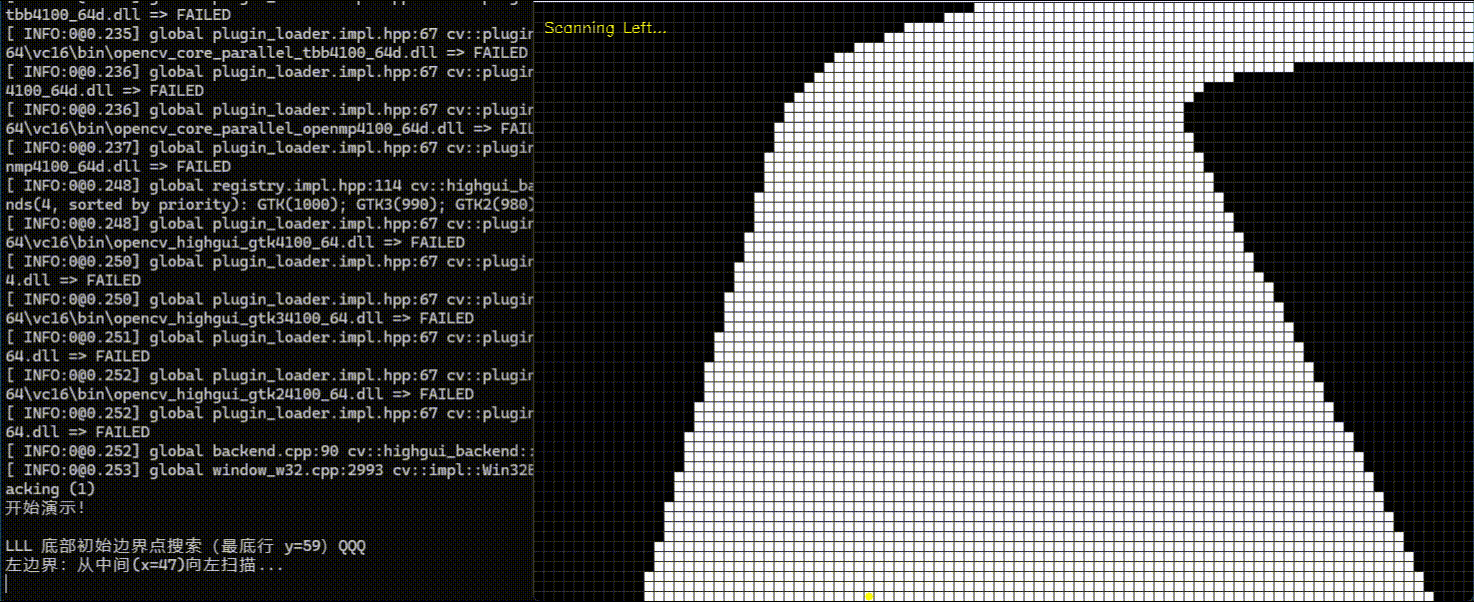 为了让大家更直观地体会优化前后的效率差异,我们也准备了对应的演示gif,可清晰看到"隔两列搜一列"的扫描过程,以及优化后像素访问量减少、搜线效率提升的实际效果,结合数据对比,能快速吃透优化逻辑。