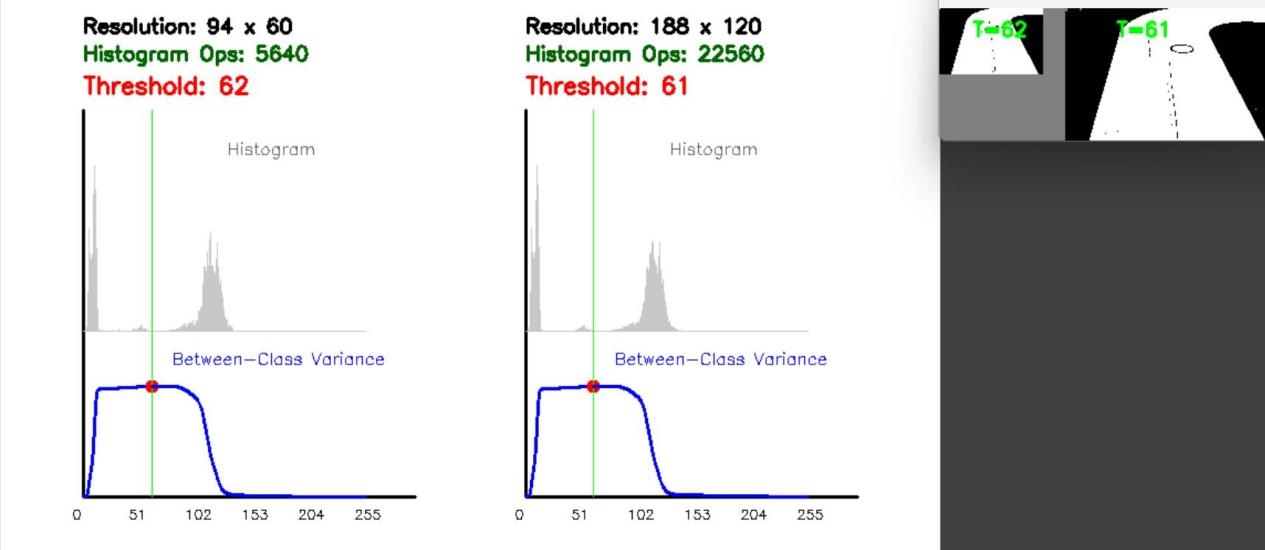 再对比我们常用的、未优化的188×120分辨率:其分辨率为188×120,直方图操作数高达22560次,刚好是94×60分辨率的4倍(标注为x4),而最终计算出的最优阈值为61。