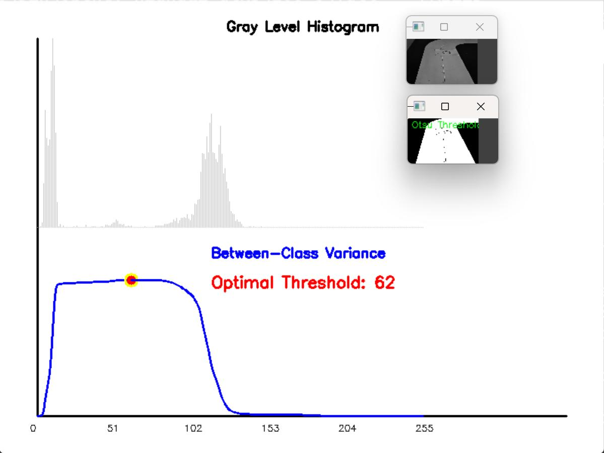 方差曲线:示意图下方的蓝色曲线,是大津法原理的核心体现,代表每个灰度阈值(0-255)对应的类间方差(Between-Class Variance)。类间方差是衡量"赛道类像素"与"背景类像素"灰度差异的核心指标,其计算逻辑是:将图像按当前阈值分为前景(假设为赛道)和背景两类,计算两类像素的灰度均值之差的平方,再结合两类像素的数量占比,最终得到类间方差。曲线的每个点,都对应一个阈值的类间方差结果。