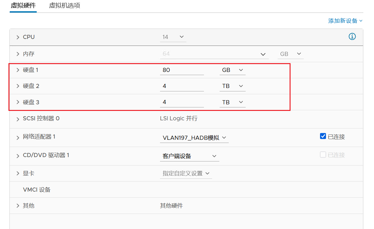 在VC界面上可以看出我的虚拟机有3块硬盘,硬盘1可以直接看出来,但是硬盘2和硬盘3无法直接通过大小看出