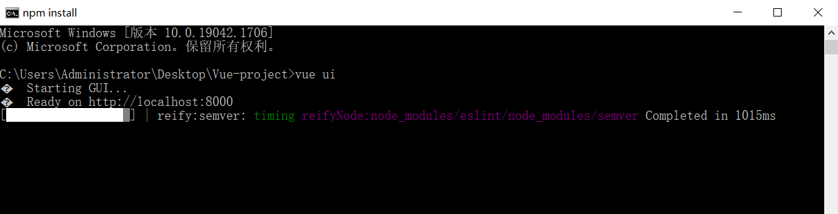 创建项目的过程,需要联网进行,这可能会耗时比较长的时间,请耐心等待。 windows的命令行,容易卡顿,我们可以虽然敲击一下键盘。