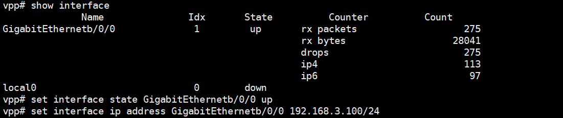 DBGvpp# set interface ip address GigabitEthernetb/0/0 192.168.3.100/24