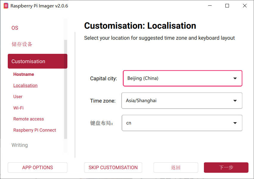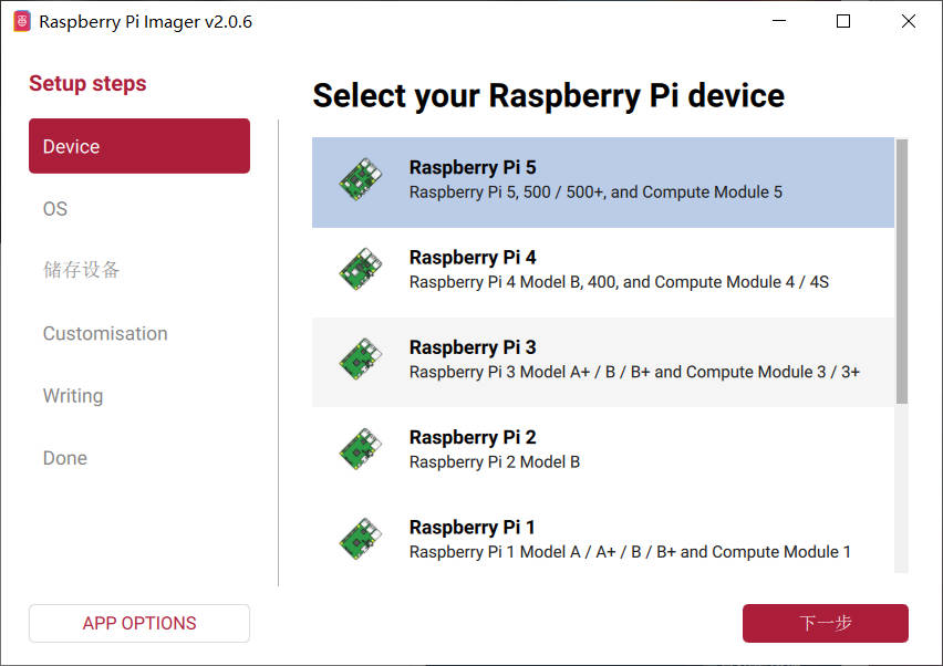 1.打开Imager烧录软件,树莓派设备按具体型号选择。
