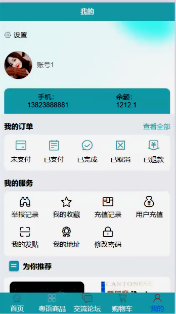 - 交易与辅助:浏览粤语商品详情、加入购物车、直接下单,管理收货地址,查看充值记录、进行账户充值,提交论坛举报及查看举报记录。