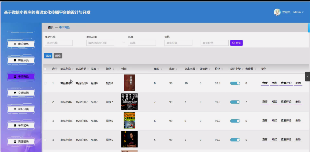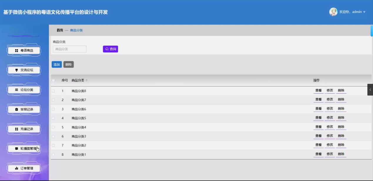 - 内容管理:管理文化分类、影视分类、粤剧分类、音乐分类、商品分类,新增、编辑、删除各类粤语相关内容(文化、影视、粤剧、音乐、商品);