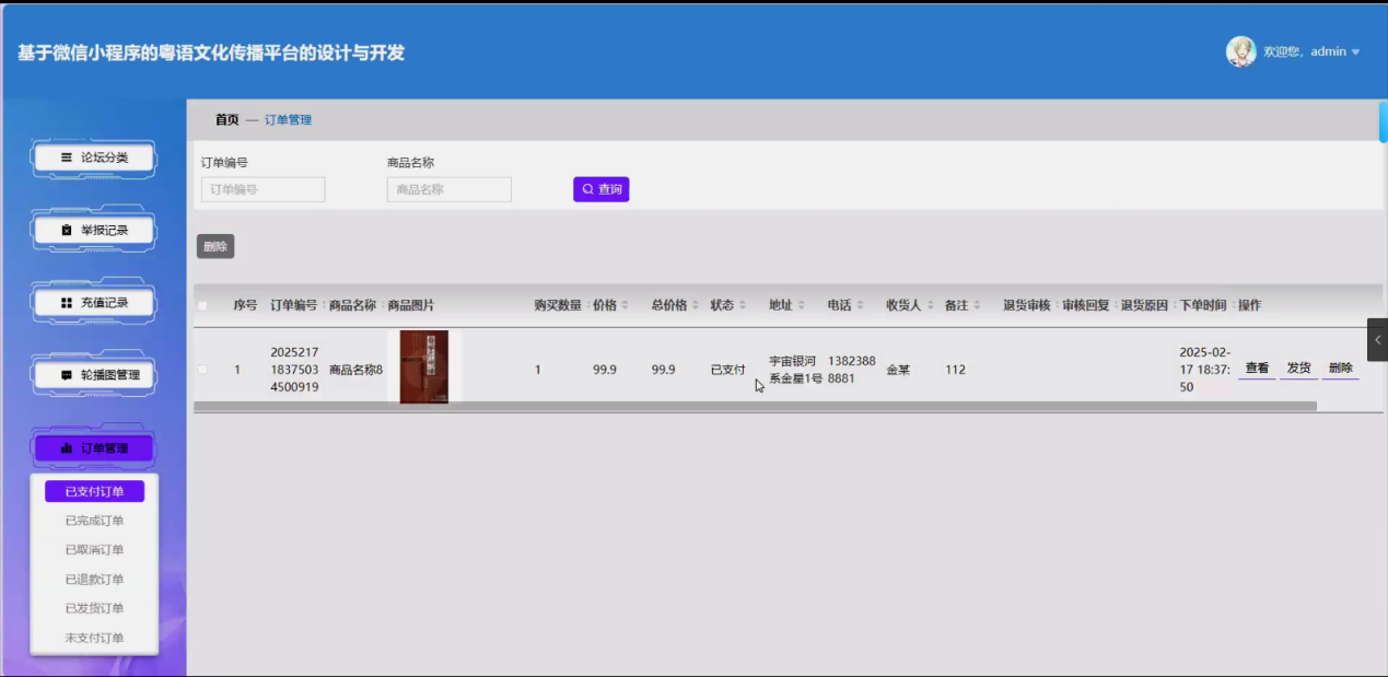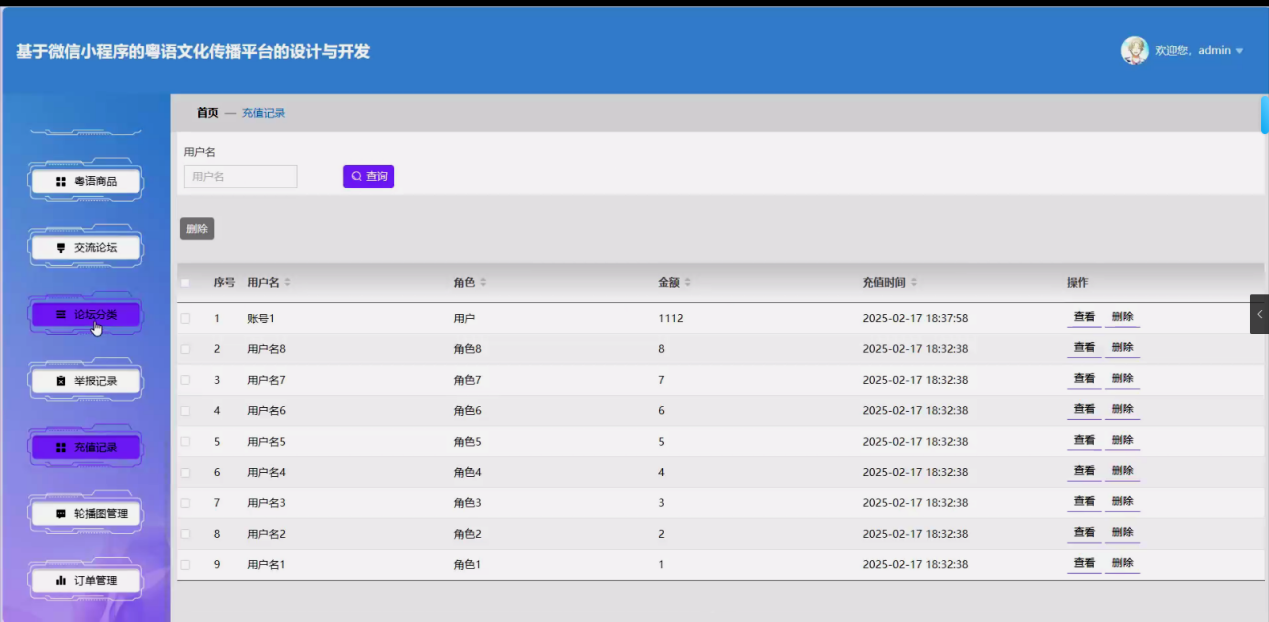 - 互动与交易管理:审核、删除交流论坛帖子及评论,处理举报记录,管理用户充值记录、订单记录(各类订单状态管控);