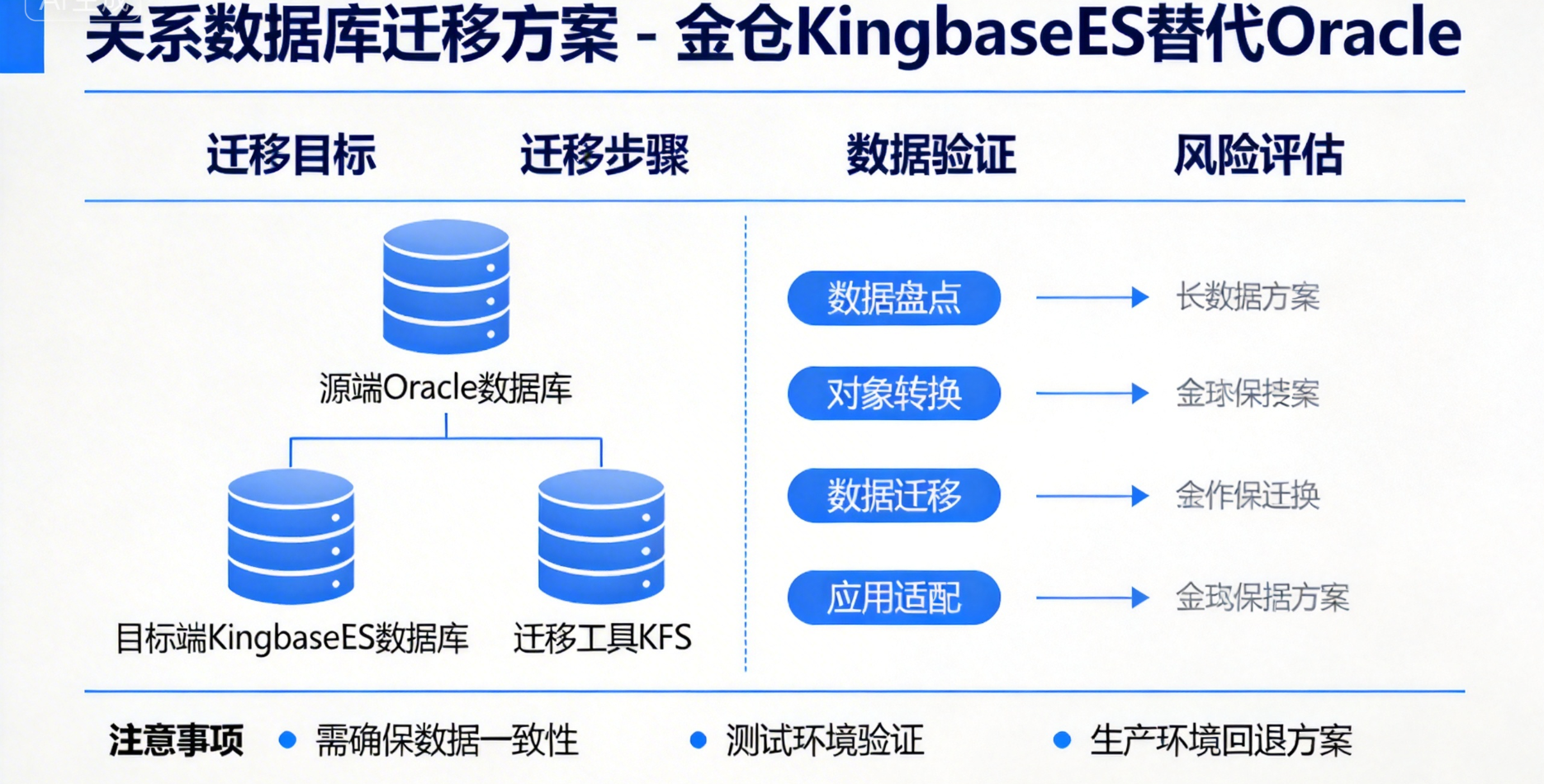 规划与评估先行 : 在启动迁移前,务必使用电科金仓官方提供的迁移评估工具对现有Oracle数据库进行全面的对象分析和兼容性检查,生成详细的评估报告,明确工作量和技术难点。