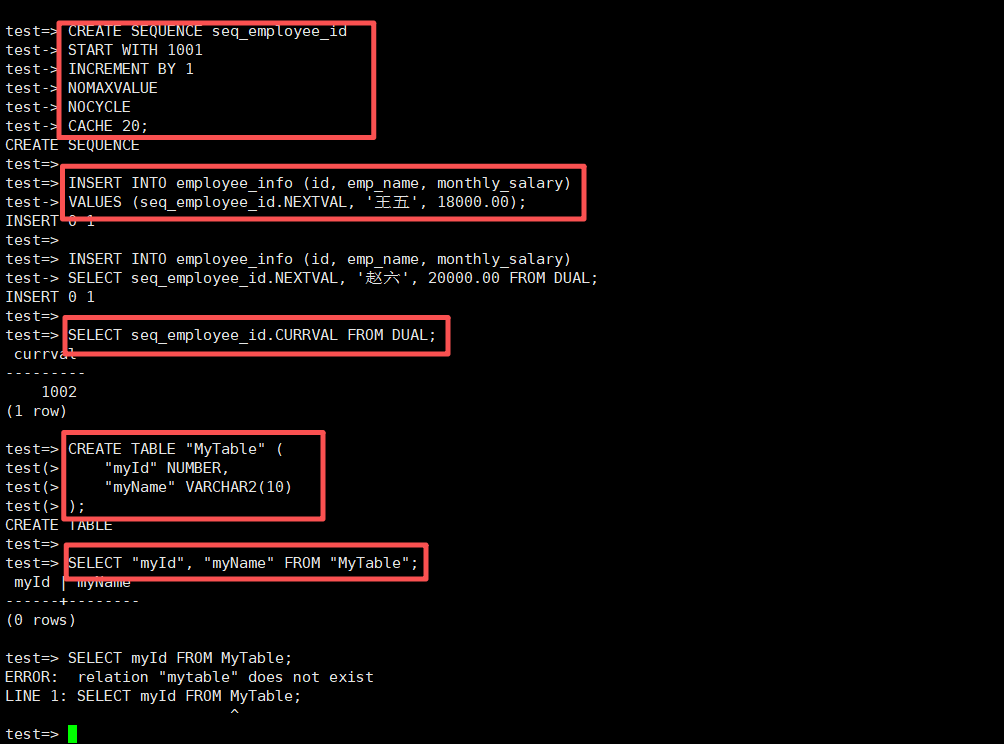 -- 创建序列,语法与Oracle完全相同