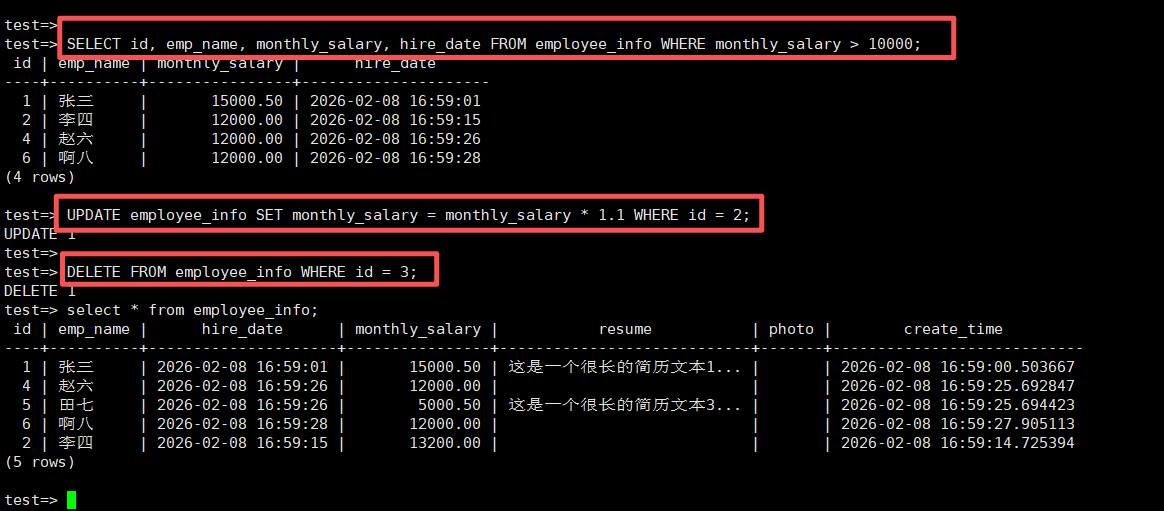 VALUES (1, '张三', 15000.50, '这是一个很长的简历文本1...');