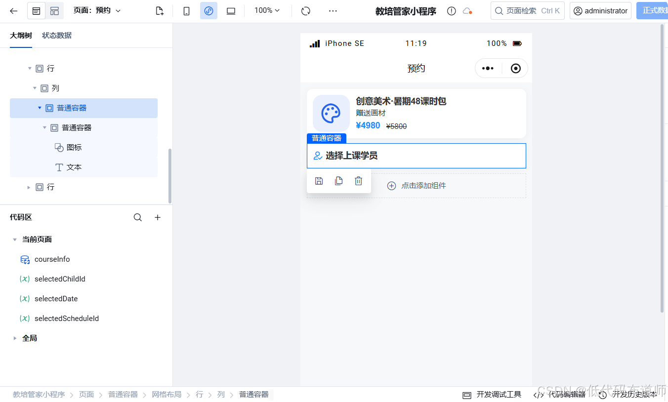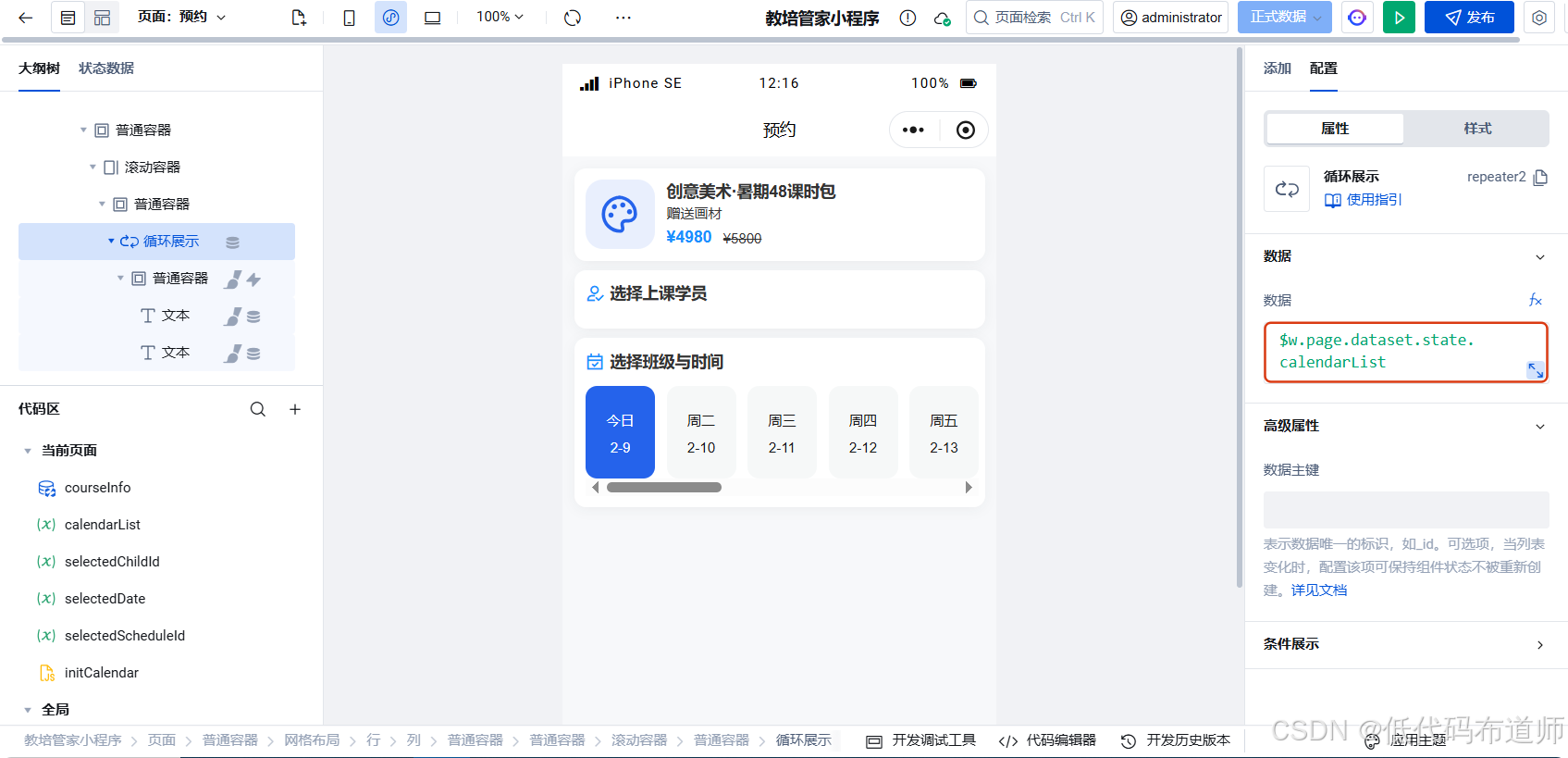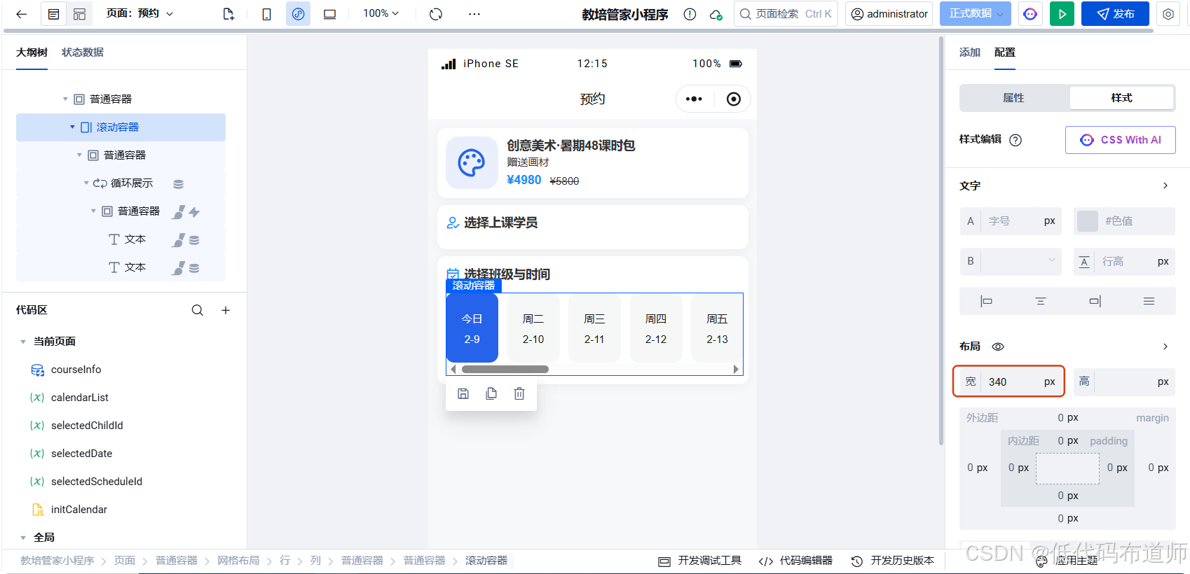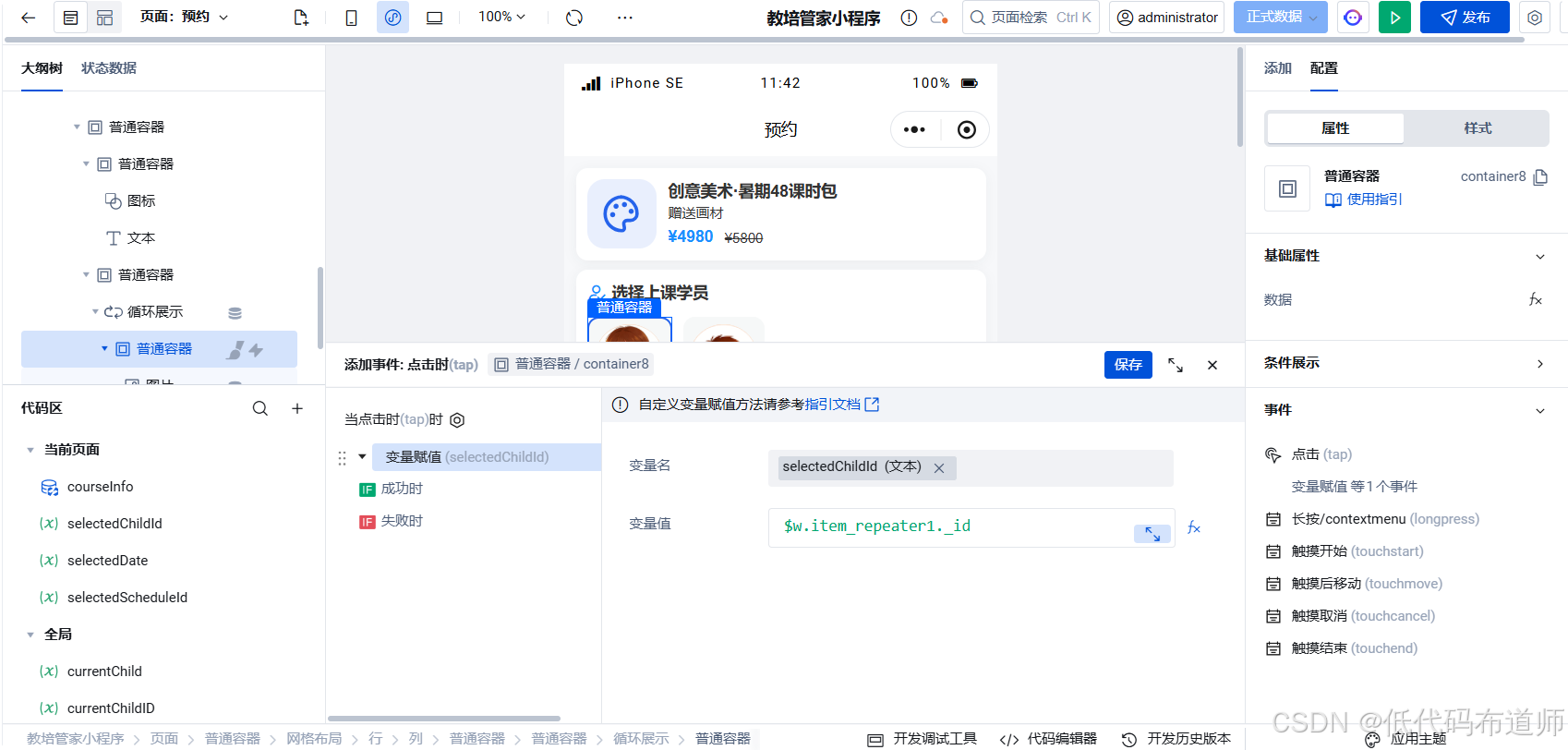 Bookings表,打通家长、学员、课包、排课与支付的关联。 - 变量驱动UI:使用页面变量控制学员选中、日期筛选及排课选中状态。