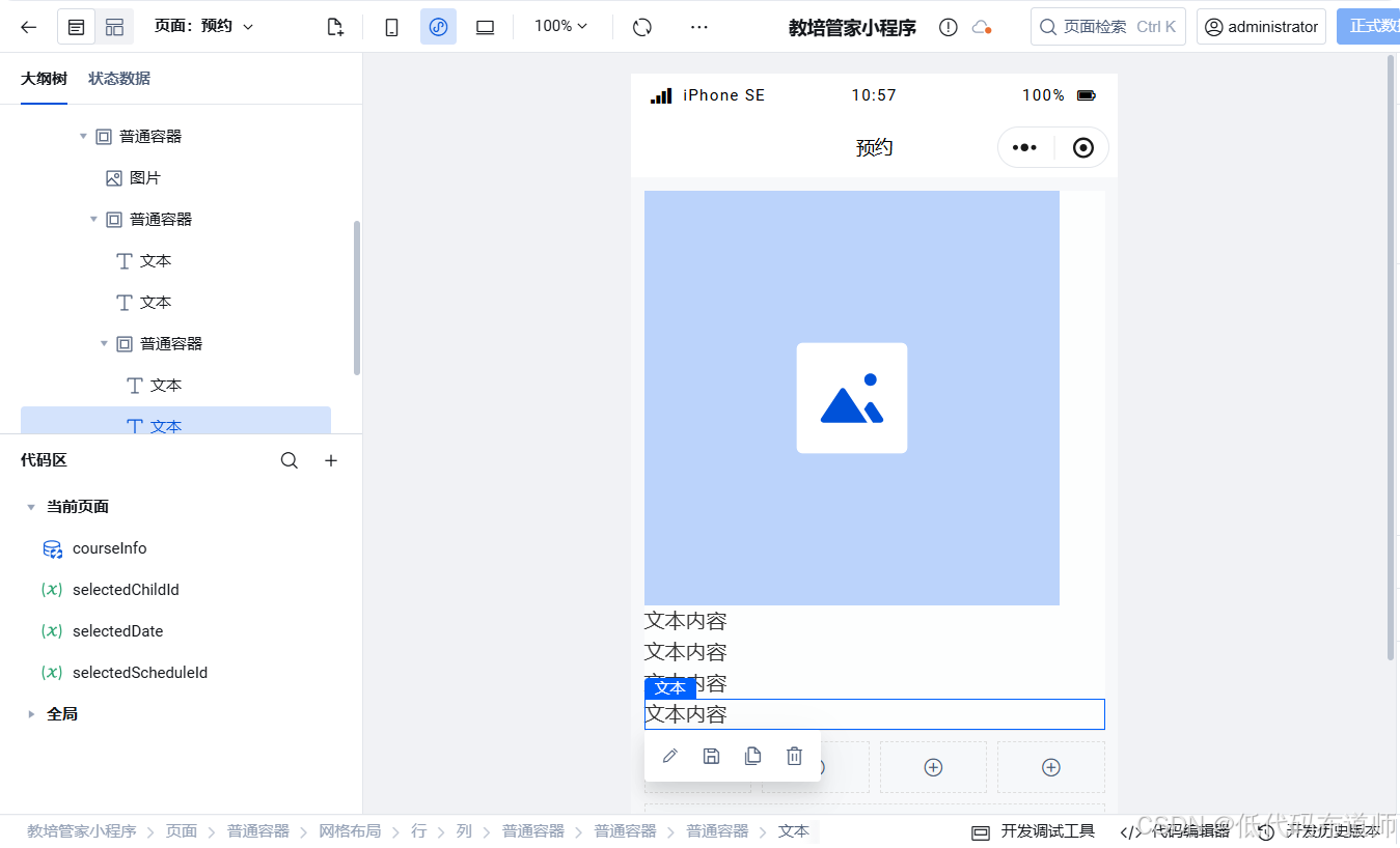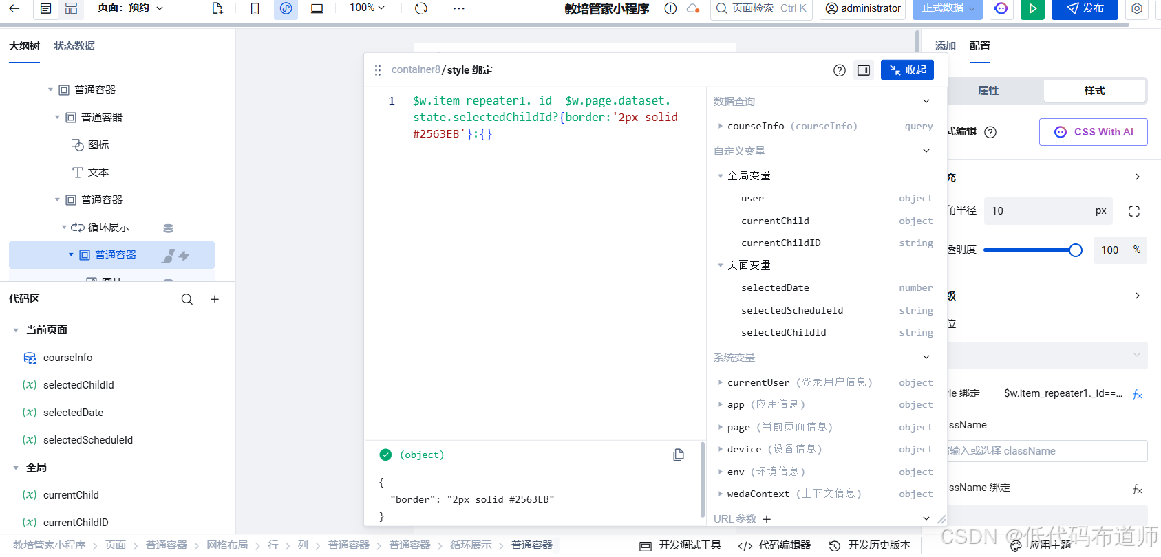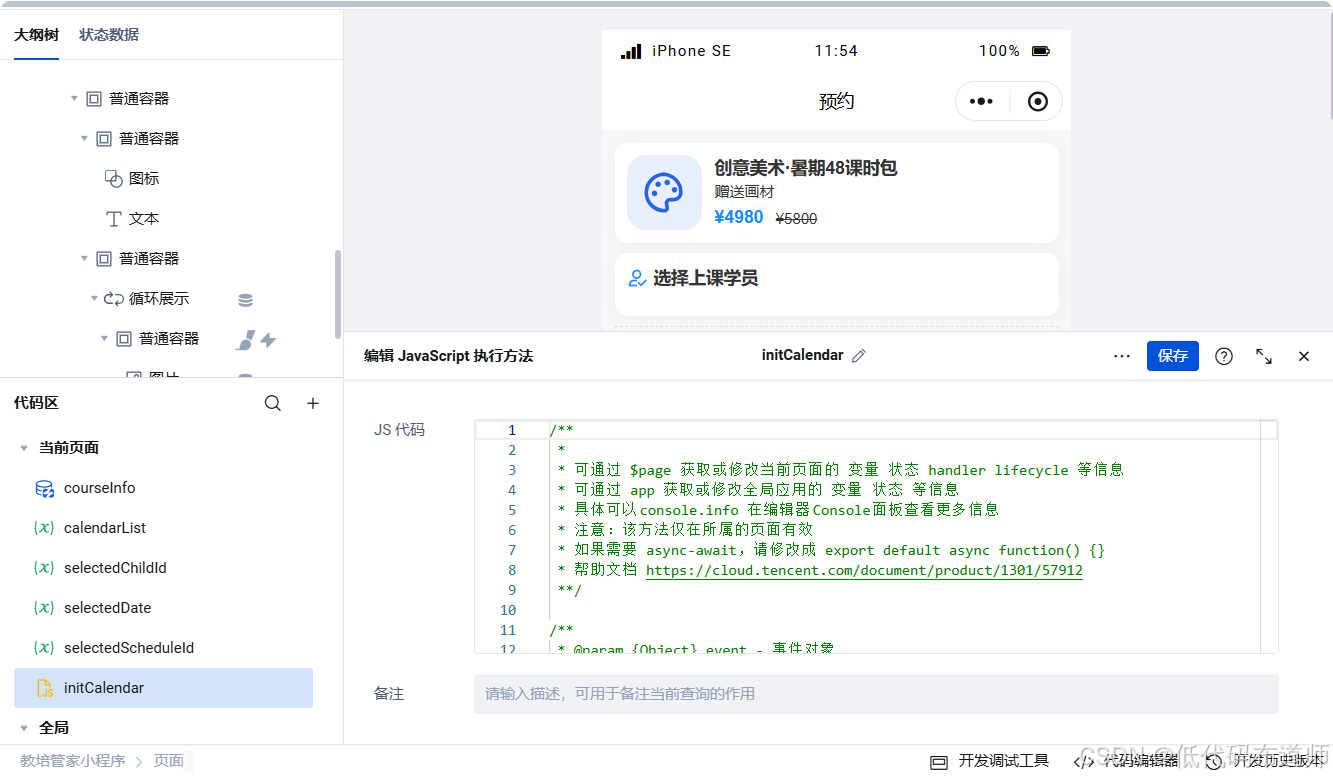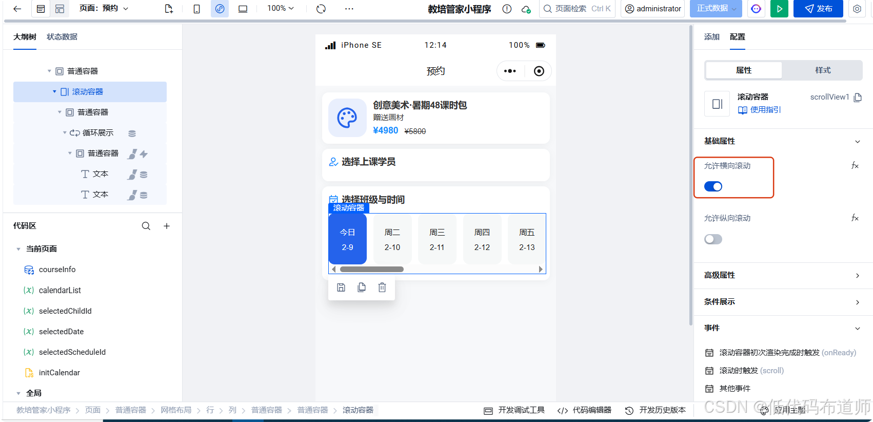 Bookings表,打通家长、学员、课包、排课与支付的关联。 - 变量驱动UI:使用页面变量控制学员选中、日期筛选及排课选中状态。