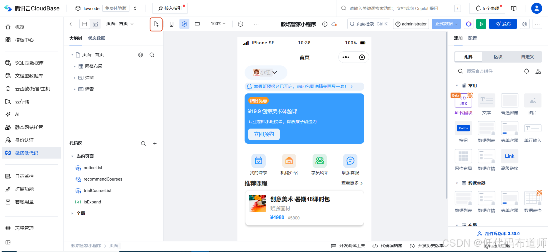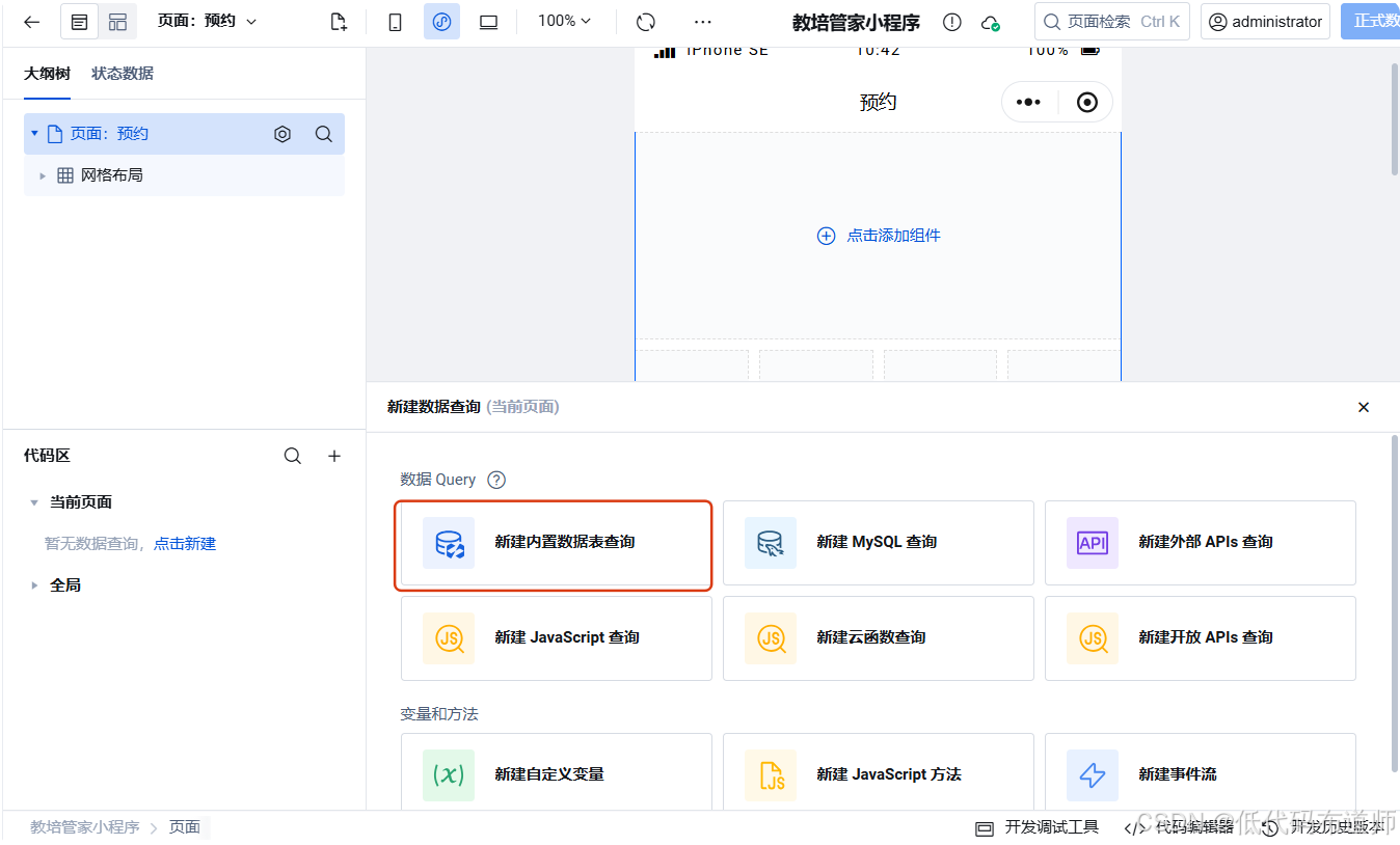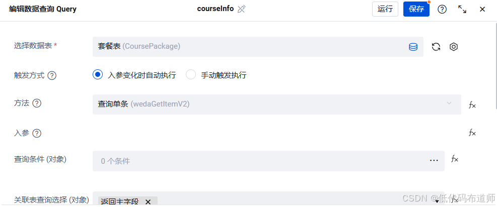 在代码区点击新建,创建课包详情变量(courseInfo),类型选择内置数据表查询