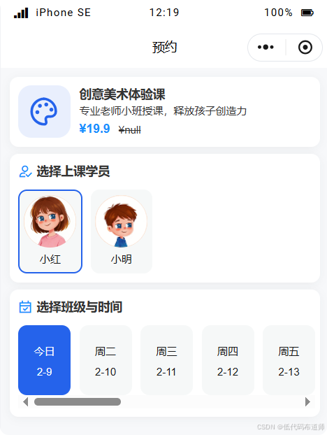 本节我们通过变量状态管理 和数据联动,实现了孩子选择和日期选定。下一篇我们继续讲解预约页面,根据选择的日期来筛选排课,供用户进行预约。