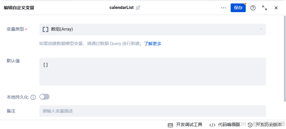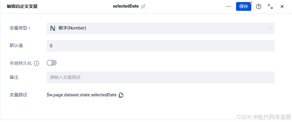 继续创建变量选中日期(selectedDate),类型选择数字,存储用户选择的上课日期,用于筛选排课列表。