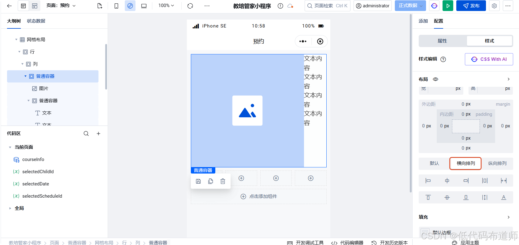 然后在第一行的列里搭建我们的卡片布局,总体上是用普通容器结合图片和文本组件进行搭建