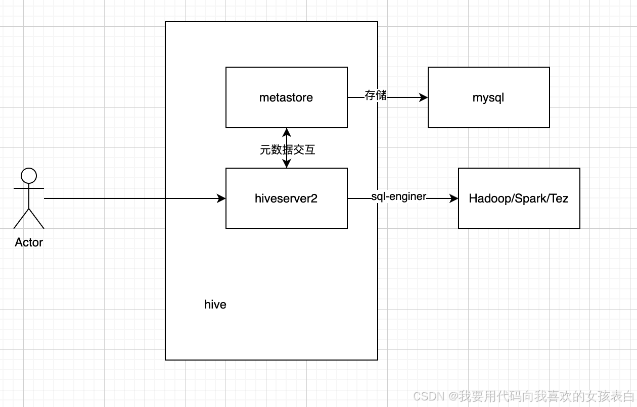 hive主要由两部分组成,metastore和query engine,metastore是负责管理元数据一般与mysql元数据库做交互,query engine是执行引擎,是将hql转换为mapreduce或者spark的东西。他本身不参与计算而是依赖hadoop进行计算。