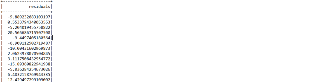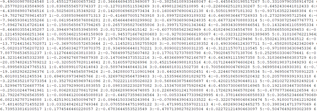 线性回归数据sample_linear_regression_data的标准测试数据集合的部分数据样本,其中,第一列是residual,用于标识模型预测值与实际值的差异,其他列是特征数据(特征值对应的索引号:特征值):