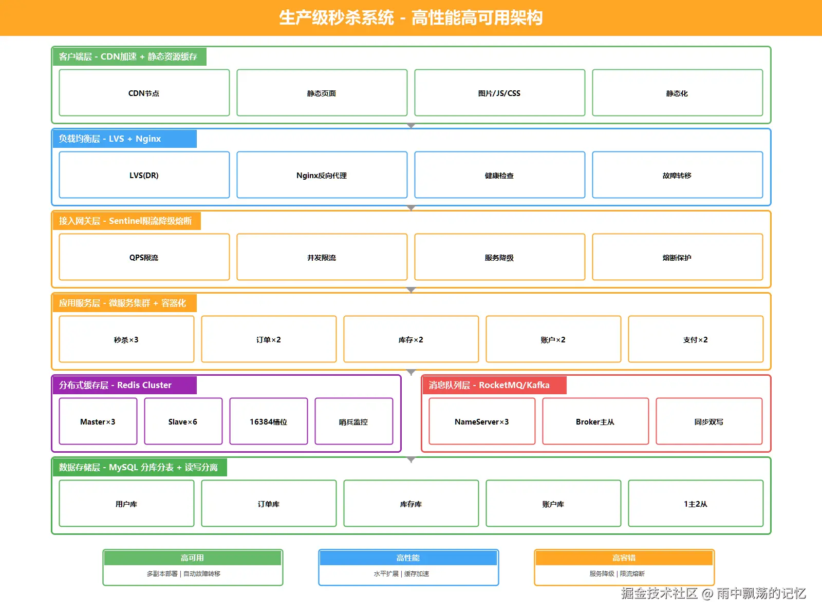 | 秒杀场景 | Redis + MQ + 乐观锁 | 结合各自优势 |