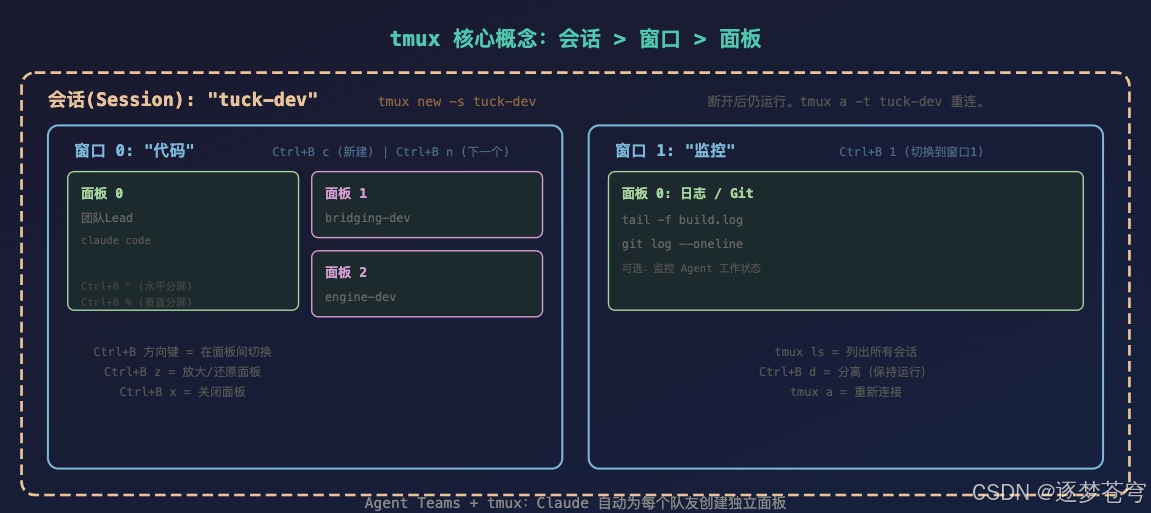 - tmux 的 Detach/Reattach 是 Agent Teams 后台运行的基础
