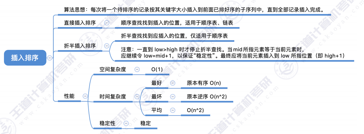 每次将一个待排序的记录按其关键字大小插入到前面已排好序的子序列中,直到全部记录插入完成